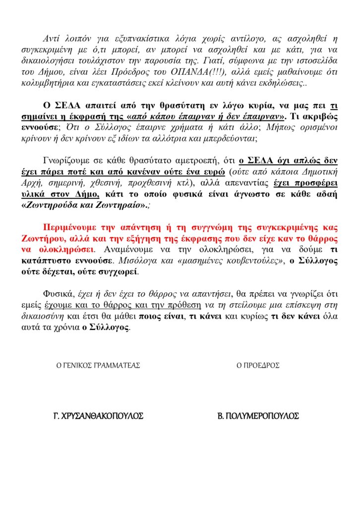 Αντί λοιπόν για εξυπνακίστικα λόγια χωρίς αντίλογο, ας ασχοληθεί η συγκεκριμένη με ό,τι μπορεί, αν μπορεί να ασχοληθεί και με κάτι, για να δικαιολογήσει τουλάχιστον την παρουσία της. Γιατί, σύμφωνα με την ιστοσελίδα του Δήμου, είναι λέει Πρόεδρος του ΟΠΑΝΔΑ(!!!), αλλά εμείς μαθαίνουμε ότι κολυμβητήρια και εγκαταστάσεις εκεί κλείνουν και αυτή κάνει εκδηλώσεις..
